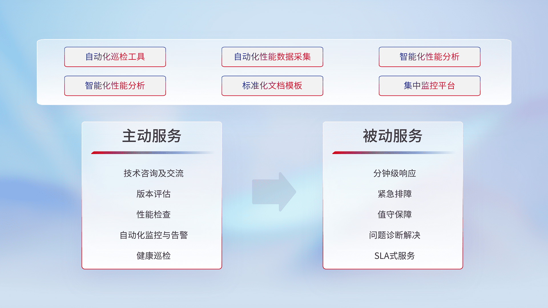 智能化工具和标准化文档,,,保障服务质量,,,,提供主动服务(包含技术咨询、、、版本评估、、、性能检查、、自动化监控与告警、、健康巡检)和被动服务包含(分钟级响应、、、、紧急排障、、值守保障、、、问题诊断解决、、、SLA服务)。。。